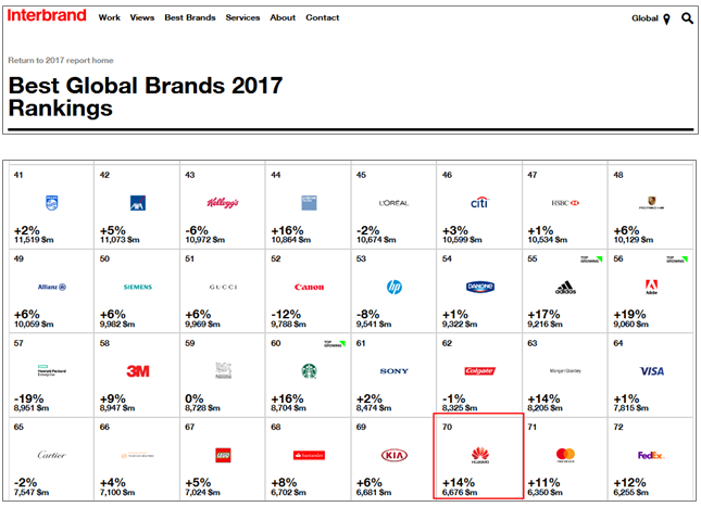 A empresa líder mundial em consultoria de marcas Interbrand anunciou o “Best Global Brands Report” de 2017 e confirmou a subida da Huawei para o número 70 - dois pontos acima de seu ranking em 2016. Sendo uma marca avaliada em aproximadamente 6,667 bilhões de dólares, a Huawei cresceu 14% ao longo do ano passado.