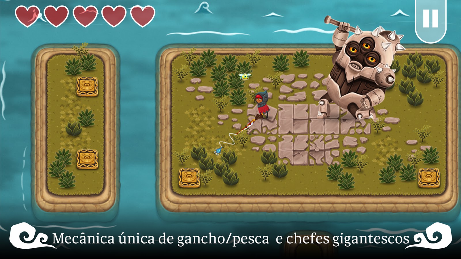 Esta mecânica está muito bem conseguida no jogo, e é uma delícia combater e resolver puzzles com esta cana de pesca multifunções. Para controlar a nossa Ganchinho Vermelho temos joystick do lado esquerdo para a mover em qualquer direcção, e do lado direito um botão para atacar e outro joystick para lançar a linha e anzol.