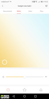 A configuração de cada equipamento está dividida em quatro zonas: recomendações, branco/amarelo, cor e sequência. São mesmas apresentadas na Mi Home, talvez de uma forma mais simples e intuitiva. O ecrã das recomendações poderá ser bastante útil, pois disponibiliza configurações para diferentes horas e eventos. Basta seleccionar uma das opções, para que a Yeelight Color Bulb passe a apresentar o comportamento pré-definido